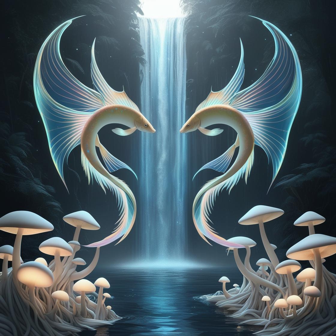 We were here before rivers carved their paths and mountains rose to kiss the skies. We watched the koi defy the currents, leaping toward transformation, and we saw its allies—mushrooms—rooted in the shadows, silently weaving life’s resilience.
